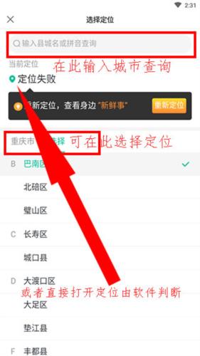 2、点击上方选择定位或者自行输入城市定位这里以巴南为例