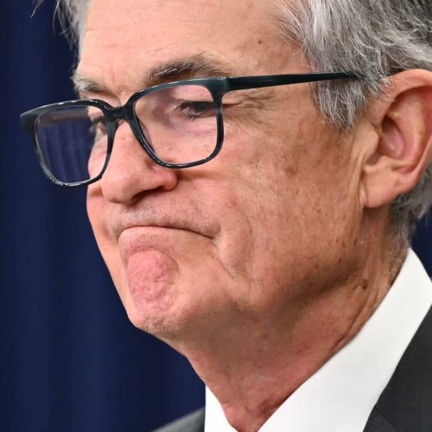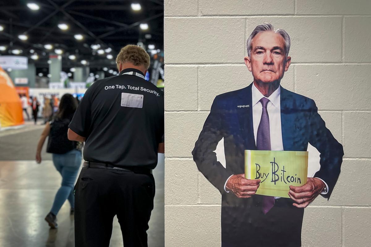 一张贴纸描绘了美联储主席杰罗姆·鲍威尔在墙上举着一块写有“购买比特币”的牌子。