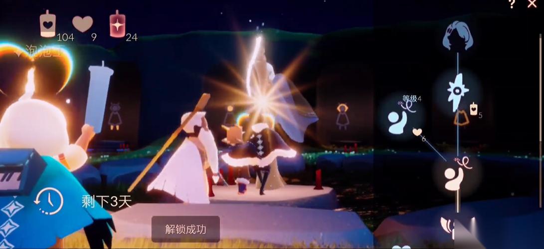 升级动作至6级是触发星星特效的关键。每级升级均需消耗一定数量的普通蜡烛,具体数量随动作树进度递增。建议玩家提前储备至少20根蜡烛以完成全部升级。6级动作的星星特效为动态粒子效果,挥手时会有金色星芒从角色掌心散落。