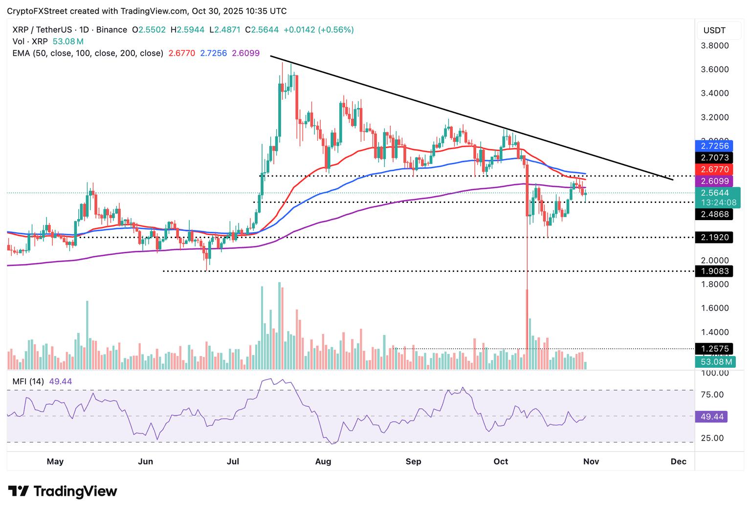 至于 XRP,多头在早盘从 2.48 美元的支撑位反弹后,正努力突破 2.60 美元的 200 日均线阻力位。MFI 指标在日线图上接近中线,表明市场风险偏好情绪稳定。