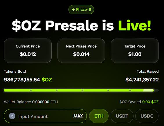 尽管 XRP、DOGE 和 SHIB 持续吸引着人们的关注,但 Ozak AI 正迅速崛起,成为引领下一波浪潮的突破性项目。目前正处于其第六个阶段。OZ预售Ozak AI 首轮发行价为 0.012 美元,已筹集超过 420 万美元,售出超过 9.8 亿枚代币。