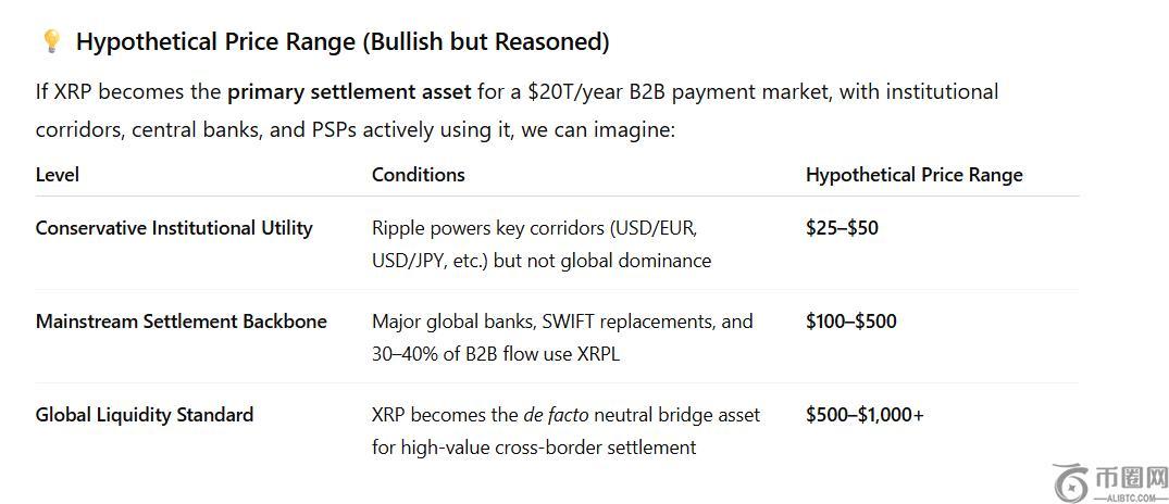 然而,如果Ripple成为全球30%至40% B2B支付的主流结算网络,其代币价格可能会上涨至100美元至500美元之间在更乐观的情况下,XRP 会变成全球作为跨境流动性的标准,其价格可能会飙升至 1000 美元以上。