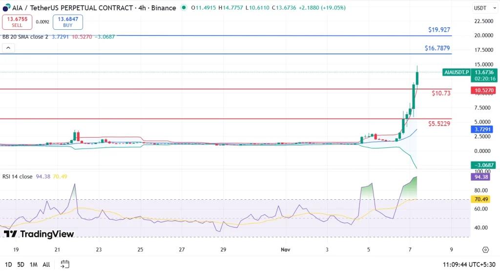 AIA代币价格飙升,创下14.79美元的历史新高。成交量高达2.429亿美元,涨幅惊人,达到452%,并突破了阻力位。这波强劲上涨推动DeAgentAI旗下的AIA代币当日涨幅高达722.8%,一周累计涨幅更是达到1004%,市值也因此飙升至18.5亿美元。