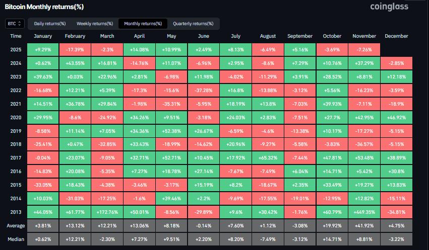 CoinGlass 的历史数据显示,尽管比特币在 10 月份下跌了 3.69%,令预期“Uptober”上涨行情的交易员失望,但 11 月份历来是比特币表现最强劲的月份,平均回报率为 41.92%。