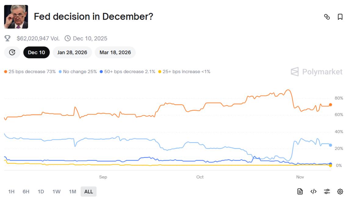 除此之外,Polymarket 上市场押注美联储今年 12 月降息 25 个基点的格概率已升至 73%,将会继续为风险资产注入流动性。
