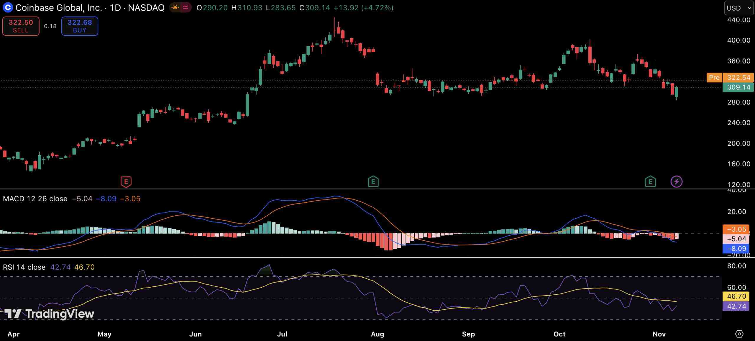 消息公布后,Coinbase Global(纳斯达克股票代码:COIN)股价出现强烈市场反应。该股收于309.14美元,盘前交易中又上涨4.38%,一度触及322.68美元左右。