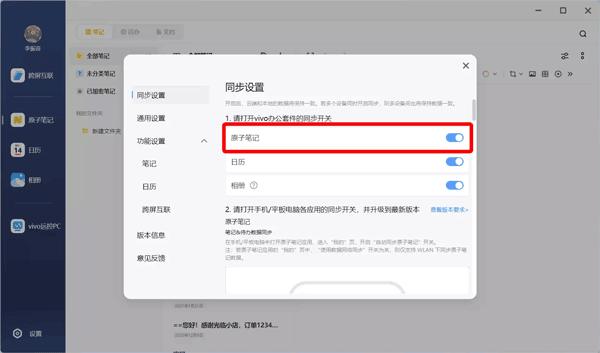 1、首先,您需要在多个设备上登录相同的vivo账号,这样才能保证您的笔记能够同步到云端;其次,在电脑的办公套件中,点击左下角的“设置”>“同步设置”,打开原子笔记的同步开关;最后,在手机/平板电脑打开同步开关这样,您就可以实现原子笔记数据在多端实时同步,切换设备也能随时查看、编辑最新数据。