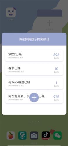 打开手机桌面长按或双指缩放进入插件管理后台,找到Toxx相关插件后选择倒计时插件(含2种样式),点击加号添加事件并长按调整插件大小,完成后即可在桌面实时查看倒计时。该功能支持自定义样式与事件置顶,助力用户高效管理重要日期。
