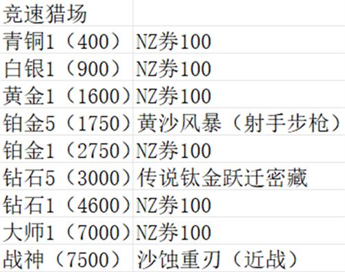猎场竞速是猎场模式的排位赛。在猎场竞速中会匹配八人两支小队进行通关速度比赛,每局比赛地图随机共3个区域,率先通关全部区域的队伍获胜。完成比赛后,根据比赛结果获得奖励(地图掉落),同时会增加/减少猎场竞速的排位分,赛季达到新段位可领取段位奖励,赛季结束后达到指定段位可获得赛季奖励。
